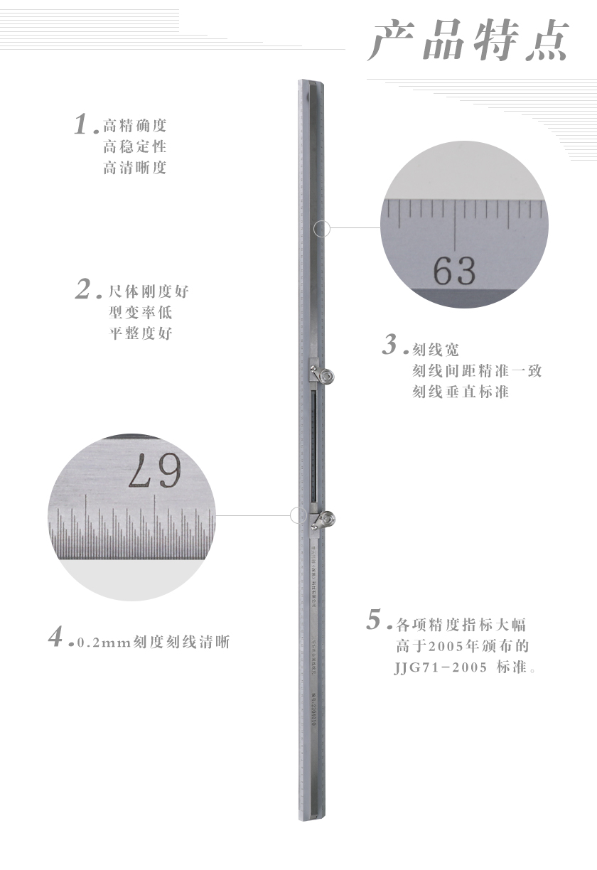 普天同創(chuàng)(深圳)科技有限公司自己主研發(fā)PTTC-ZC1型三等標準金屬線紋尺,作為自主知識產(chǎn)權(quán)的高科技、創(chuàng)新型二十一世紀新產(chǎn)品,集現(xiàn)代科技、加工中心全自動化制作工藝技術(shù),采用激光刻制刻劃線、標選讀數(shù)與圖型。產(chǎn)品具有高精確度、高穩(wěn)定性、高清晰度,刻線寬、刻線間距精準一致,刻線垂直標準,尺體剛度好,型變率低,平整度好,各項精度指標大幅高于2005年頒布的JJG71-2005 標準。