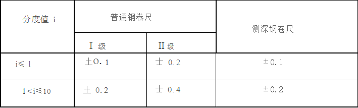 普通鋼卷尺毫米分度和厘米分度的示值誤差不超過表 1 的要求。