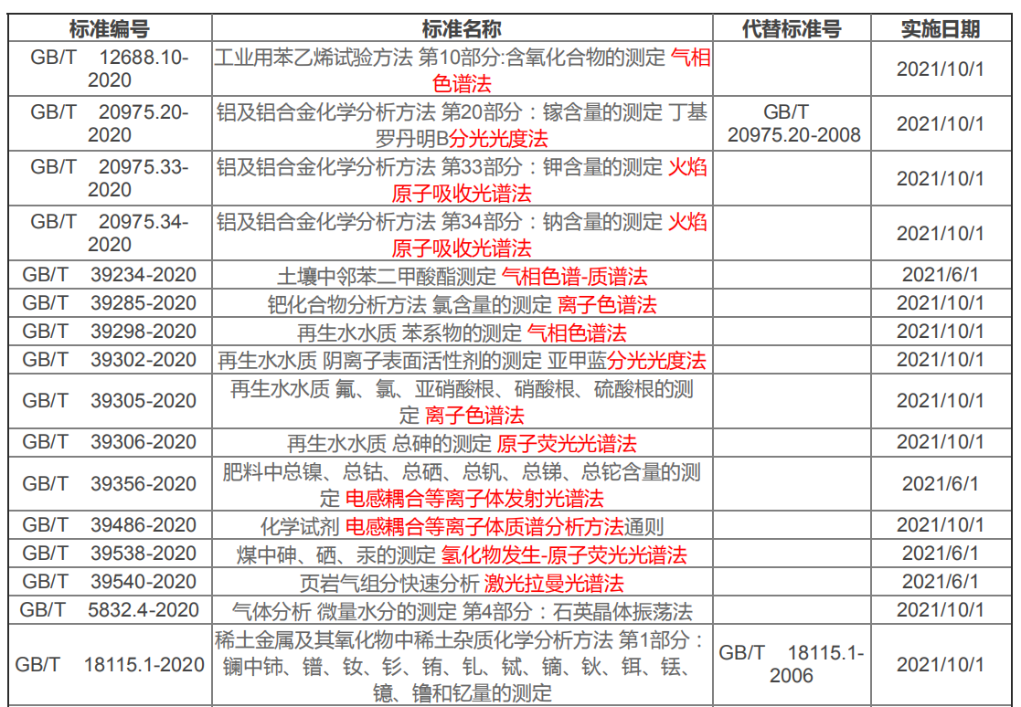 批準發(fā)布586項推薦性國家標準中,數(shù)十條涉及了光譜、色譜、質(zhì)譜分析方法,包括氣相色譜法、火焰原子吸收光譜法、氣相色譜-質(zhì)譜法、離子色譜法、電感耦合等離子體發(fā)射光譜法、電感耦合等離子體質(zhì)譜分析方法、氫化物發(fā)生-原子熒光光譜法、激光拉曼光譜法等。