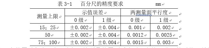 百分尺是一種應(yīng)用很廣的精密量具,按它的制造精度,可分0級(jí)和1級(jí)的兩種,0級(jí)精度較高,1級(jí)次之。百分尺的制造精度,主要由它的示值誤差和測(cè)砧面的平面平行度公差的大小來決定,小尺寸百分尺的精度要求,見表3-1。從百分尺的精度要求可知,用百分尺測(cè)量IT6~I(xiàn)T10級(jí)精度的零件尺寸較為合適。